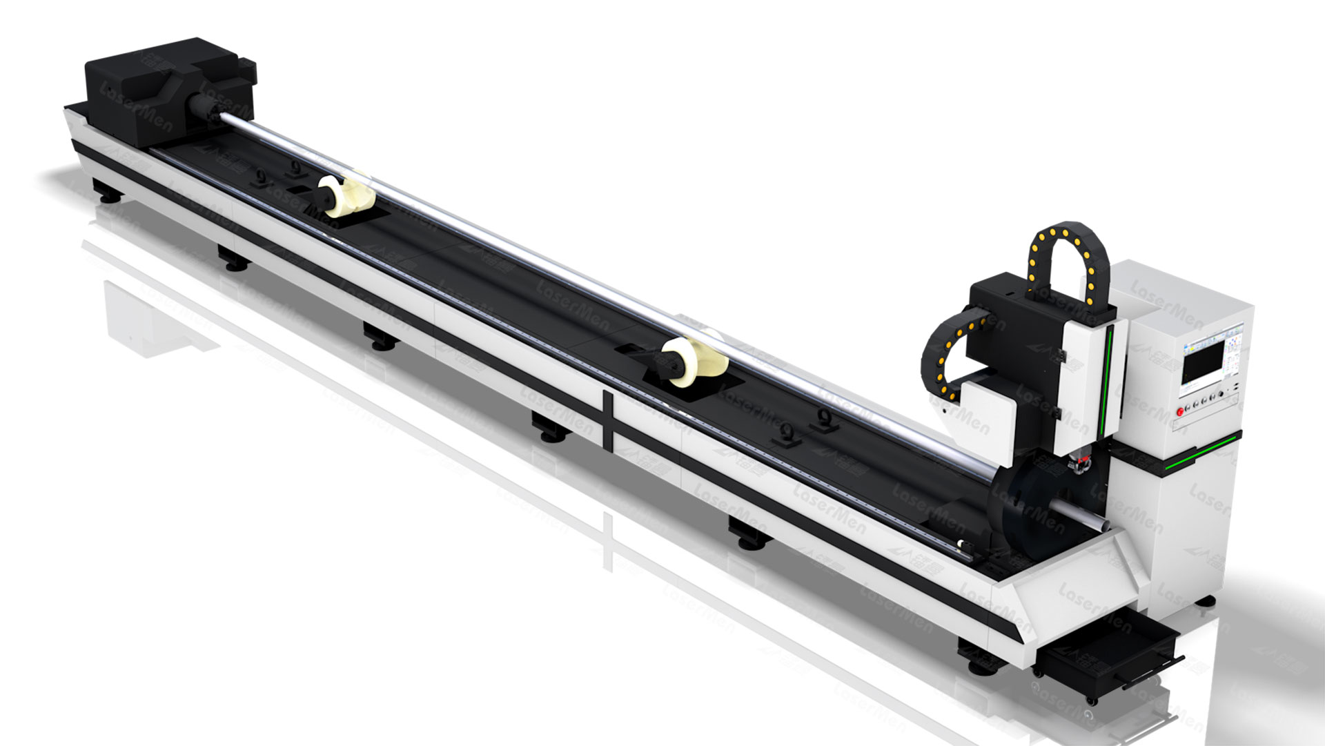 3、前卡盤避讓式切法,切割最后一段管材時將后卡盤穿過前盤,縮短激光頭與后卡盤卡爪間的距離,從而將尾料長度減小至最短,提高材料利用率,降低生產成本。