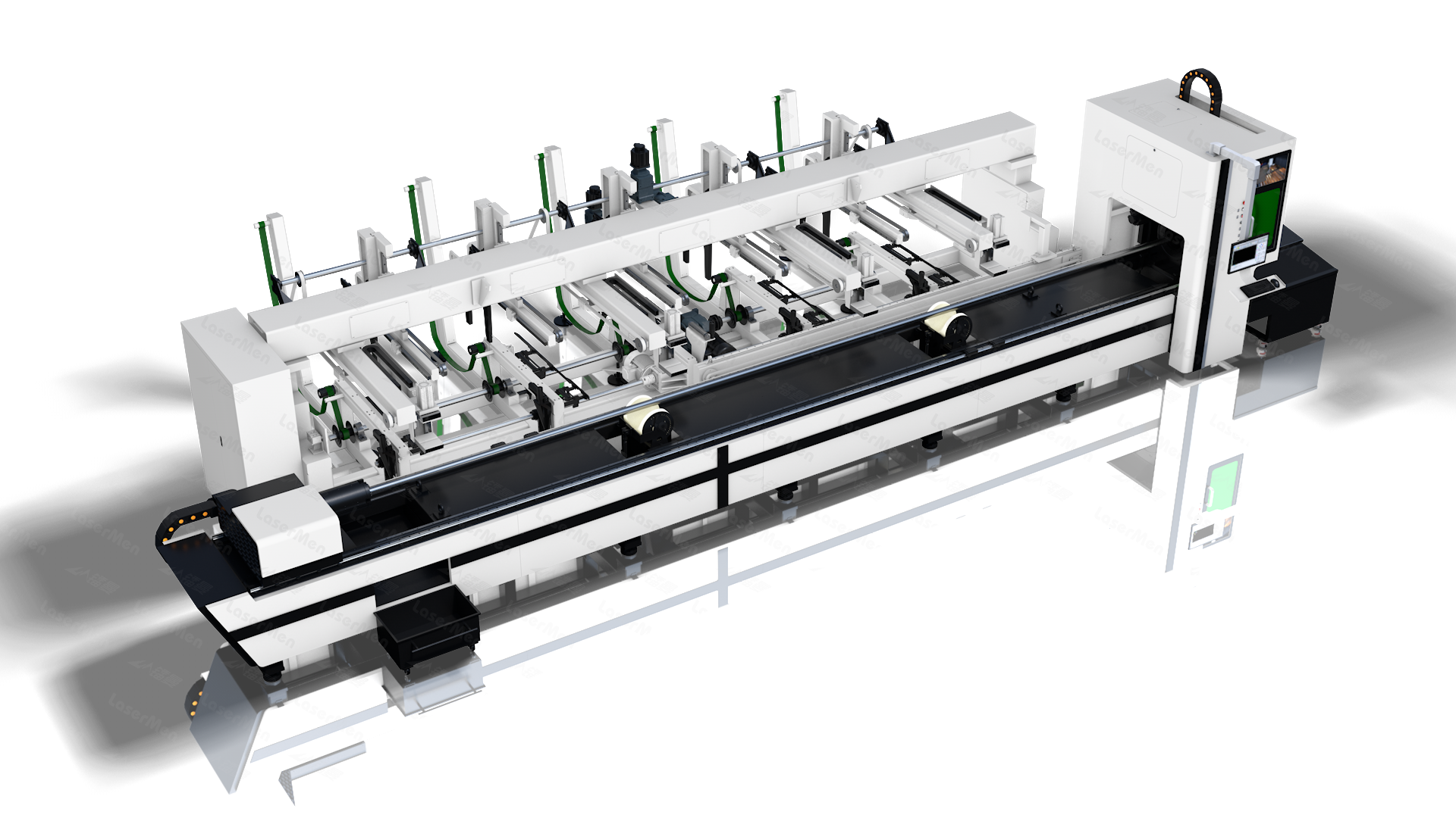 3、前卡盤避讓式切法,切割最后一段管材時將后卡盤穿過前卡盤,縮短激光頭與后卡盤卡爪間的距離,從而將尾料長度減小至最短,提高材料利用率,降低生產成本。