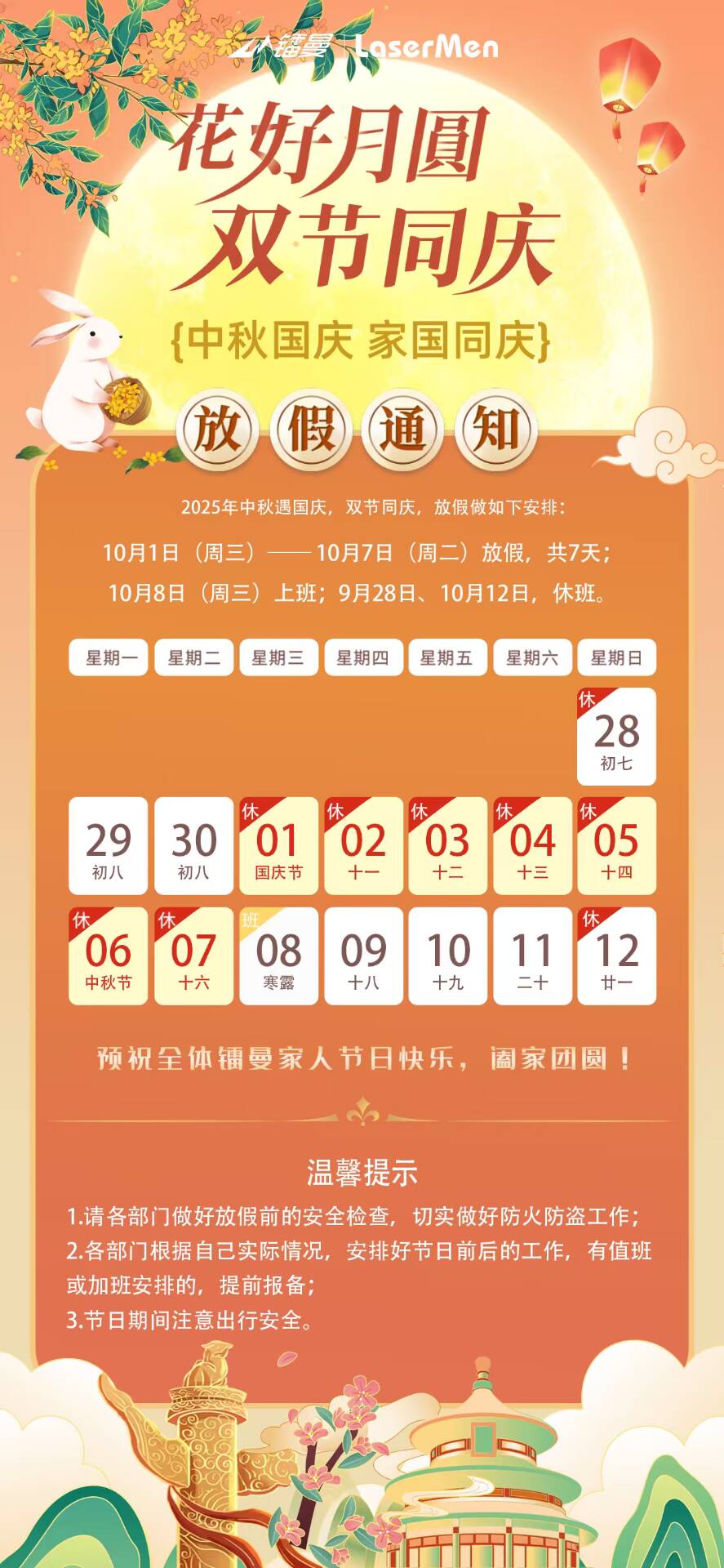 愿我們?cè)?“家國(guó)同慶” 的美好氛圍中,心懷感恩、勇?lián)姑詩(shī)^斗之姿共赴新征程,以實(shí)干之力書(shū)寫(xiě)新篇章。鐳曼激光衷心祝愿?jìng)ゴ蟮淖鎳?guó)山河錦繡、繁榮昌盛!祝愿全體員工、合作伙伴及社會(huì)各界朋友雙節(jié)安康、闔家幸福、萬(wàn)事順意!